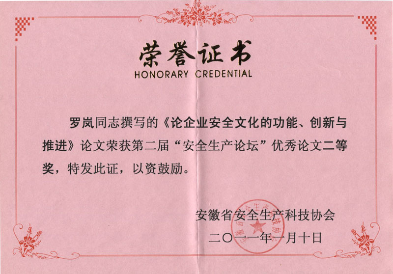 我队罗岚论文荣获2010年度省安全生产科技协会论文评比二等奖