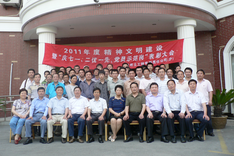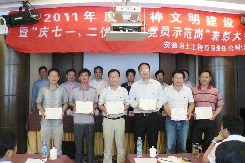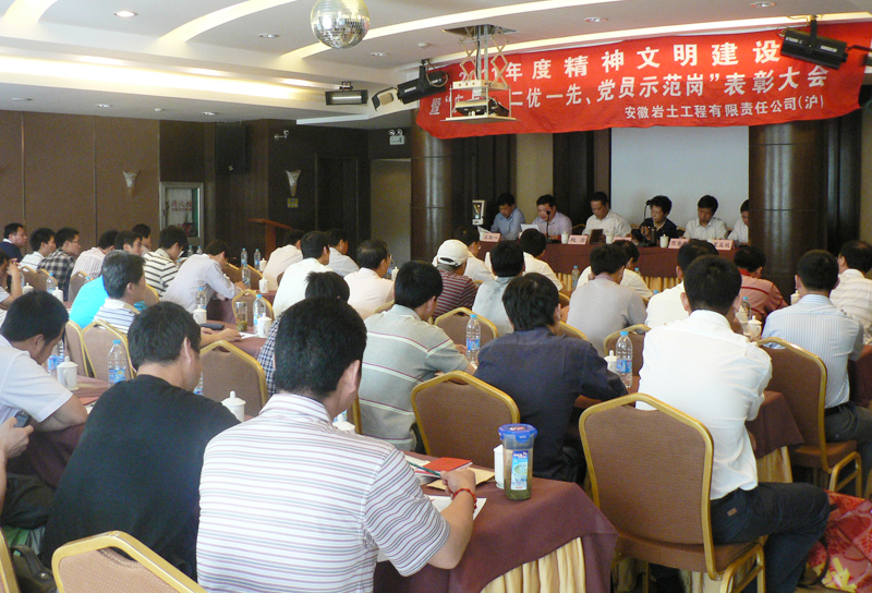 6月3日,安徽岩土工程有限责任公司(沪)2011年精神文明建设暨庆七一、二优一先、党员示范岗表彰大会在上海市佘山松浦召开。安徽省驻沪办建管处处长韩晋清、队长赵宏、副队长、安徽岩土公司总经理倪晋贵、安徽岩土公司总工程师喻荣华出席会议。安徽岩土上海分公司党政领导班子成员、上海分公司各工程处经理、副经理、党支部书记、上海分公司全体党员及部分职工代表参加会议。会议对获得上海市文明单位称号的安徽岩土工程有限责任公司(沪)及二优一先、党员示范岗创建活动中涌现出来的先进党支部、优秀党务工作者、优秀共产党员、精神文明创建先进个人进行了表彰。