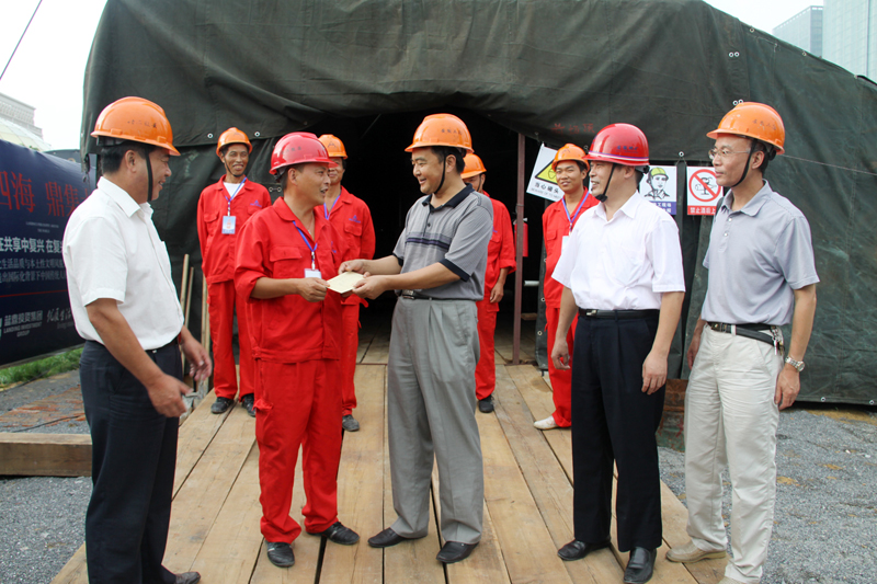 8月11日下午,省地质工会主席张明文、省地质工会杨昶明在队长赵宏、队党委书记王新民、副队长林宾的陪同下,来到滨湖新区队工勘院第五工程处打井机台慰问。张明文主席在听取我队领导介绍滨湖新区打井情况以及文明机台创建等情况后,对我队工勘院在滨湖新区打井取得的成果和文明机台创建取得的成绩表示祝贺,同时,他希望机台注意安全生产,鼓励一线职工克服困难、共同努力、再立新功,并向机台职工送上了慰问金。
