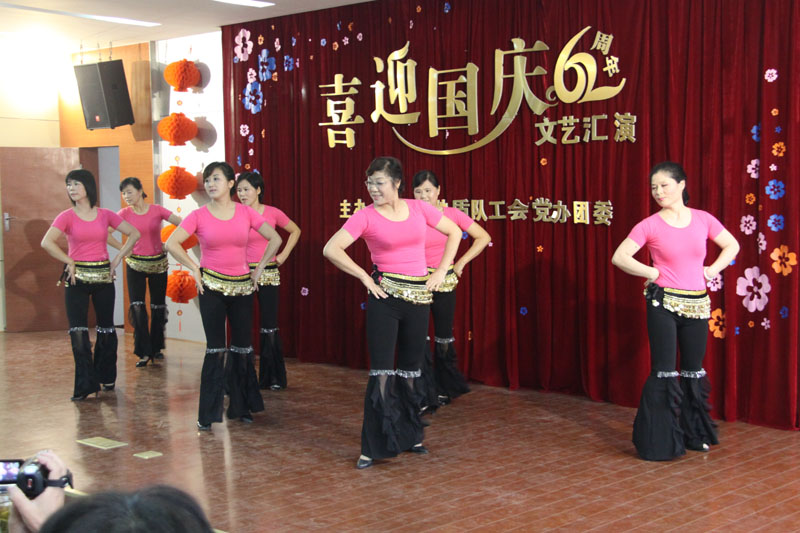 在国庆来临之际,我队呈现一派热烈的节日气氛:大院西、北大门上方悬挂的大红灯笼和“欢度国庆”几个金色大字十分引人注目。西大门宣传橱窗前,人们欣赏着由党办和机关二分会主办的“庆国庆职工书画摄影展”,橱窗里书画、摄影、剪纸、篆刻等各种展品反映了我队职工工作之余的高雅情趣和对祖国的一片热爱之情。