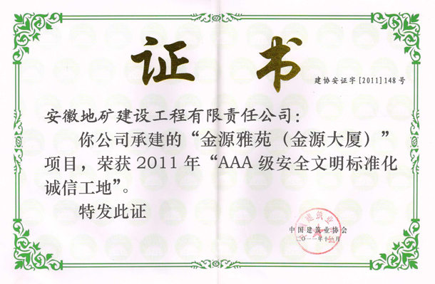 11月22日,中国建筑业协会建筑安全分会2011年年会暨会员代表大会在海南省海口市召开,我队地建公司副总经理计震率相关部门负责人参加代表大会。会议表彰了全国建设工程项目AAA级安全文明标准化诚信工地获奖项目,由我队地建公司承建的“金源雅苑(金源大厦)”项目荣列其中。