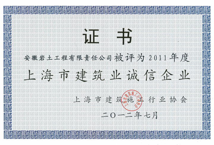 在上海市建筑施工行业协会组织开展的上海市建筑施工企业和进沪建筑施工企业的诚信建设评价评选活动中,安徽岩土工程有限责任公司再次被评为2011年度“上海市建筑业诚信企业”,这是该公司自2007年以来已连续五年获此殊荣。