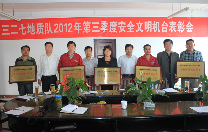 队纪委书记史俊在表彰会上传达了我队第四季度省厅基金项目和庐枞整装勘查生产调度会的会议精神,并充分肯定了安全文明机台评比活动对于机台安全文明生产管理及钻探生产起到的积极促进作用。史俊强调,庐枞整装勘查区工作量大,投入设备多、人员多,受到部、厅、局及媒体的高度关注,大家一定要增强紧迫感和进取心;各级主要负责人要增强安全意识,营造“我要安全”的氛围,职工要提高安全生产技能,做到“我会安全”;要通过加强作业人员劳动保护、改善作业环境等措施,做到机台安全文明绝不放松。