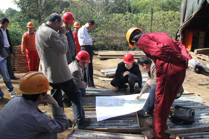 近日,我队在庐枞整装勘查区深部找矿又取得新进展。11月5日,队长赵宏、党委书记王新民、副队长、总工程师张千明一行赴现场查看岩芯并指导下步找矿工作。