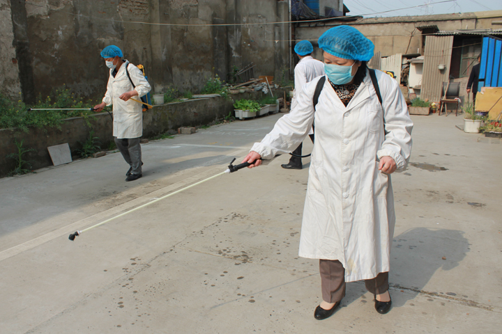 职工医院的工作人员正在对大院生活区进行喷药式消毒