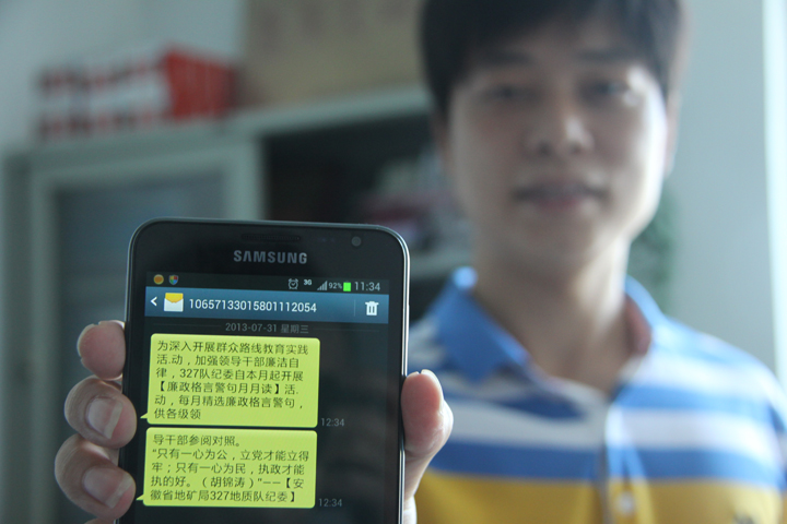 近日,队党委、纪委成员和中层干部的手机先后收到一条“只有一心为公,立党才能立得牢;只有一心为民,执政才能执得好。”的廉政格言警句短信,该队党委、纪委通过手机短信的形式把勉励和关心送到每位领导干部的身边。