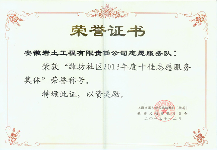 12月5日上午,在上海市浦东新区潍坊街道一楼会议室召开的“2013年度潍坊社区志愿服务工作表彰大会”上,安徽岩土工程有限责任公司(上海分公司)志愿服务队荣获了“潍坊社区2013年度十佳志愿服务集体”荣誉称号,同时,该志愿服务队的两名队员周宝和韦月分别荣获了“潍坊社区2013年度优秀志愿者”荣誉称号。