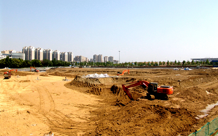 图为正在进行土方开挖和基坑支护施工的合肥凤凰文化广场项目现场