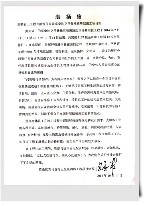 该项目历时8个多月,期间工作量增加了2次,超出合同工程量的2倍多,桩数达到1167根,项目部克服地层复杂、配件材料紧缺、工期长、气候炙热等困难,不断调整施工工艺和方法,确保施工的顺利开展和按期完工,得到外经公司项目组的高度评价,并发来了表扬信。