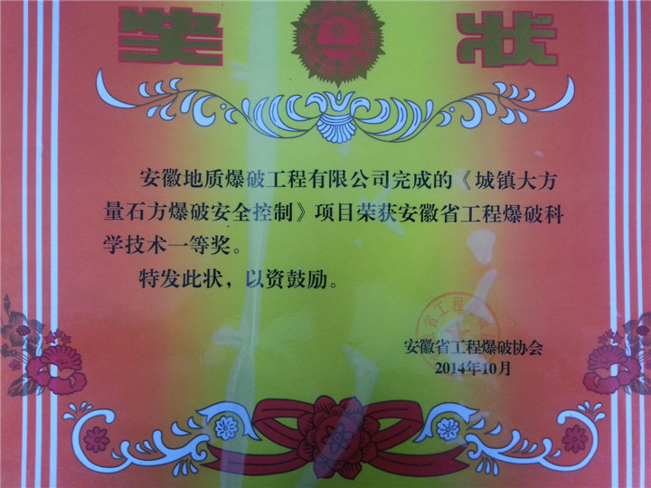 据了解,由队爆破公司2011年9月承接的合肥市御安西郡回迁安置小区深基坑石方爆破工程,石方总量达23万余立方米,是历年来合肥市最大的城市石方控制爆破工程。本爆破工程每次爆破炸药使用量为2000kg左右,每周爆破3-4次,这在城镇爆破中是少见的。经过精细化管理,科学施工,仅用三个半月,该公司就完成了全部爆破任务,未产生任何爆破安全危害和扰民事件,得到了业主充分的肯定,取得了良好的社会效益和经济效益。“城镇大方量石方爆破安全控制”工程于2014年10月被安徽省工程爆破协会评为安徽省工程爆破科学技术奖一等奖(完成者:茆恒阳、廖和平、李文俊、万佳)。同时,该公司被安徽省工程爆破协会评为安徽省爆破行业优秀集体奖。