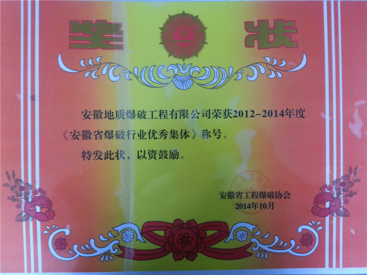 日前,从安徽省工程爆破协会获悉,在安徽省工程爆破协会第四届三次理事会会议上,我队地质爆破工程有限公司荣获安徽省工程爆破科学技术奖一等奖和2012—2014年度安徽省爆破行业优秀集体称号。