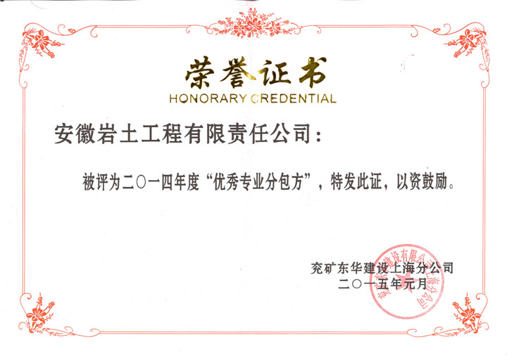 近日,队岩土公司上海分公司被兖矿东华建设上海分公司评为2014年度“优秀专业分包方”。