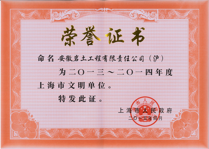 近日,安徽岩土工程有限责任公司(沪)文明建设又结硕果,喜获2013—2014年度“上海市文明单位”称号,这是该公司第七次(连续第五次)获得此项殊荣。5月12日上午,该公司党办负责人从上海市浦东新区国资党群处领取了证书。