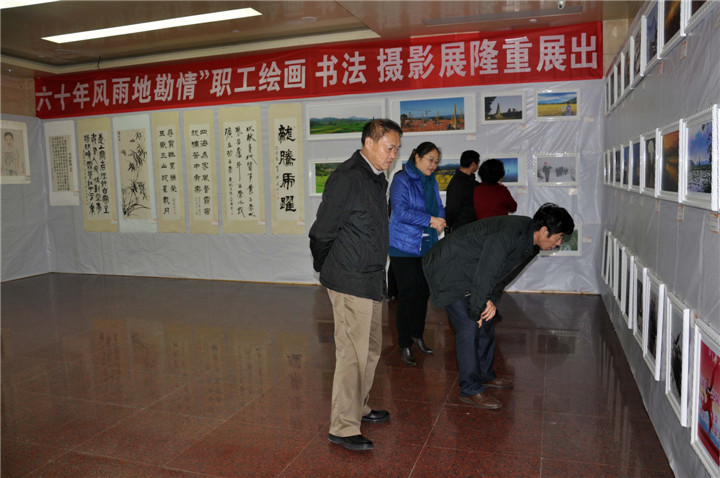 展厅里60幅精美的书画、摄影作品吸引了王主席的注意,他细致地观看每一幅作品,详细了解作者的基本情况和创作情况,对我队职工高雅的艺术情操和参展作品的艺术水平给予了很高评价。当看到几十年前反映地质人罗河铁矿找矿会战的照片时,他连称:“难得!难得!应该大力宣传弘扬我们地质人的光荣传统!一些具有典型意义的照片,都应该及时收集整理存档。”