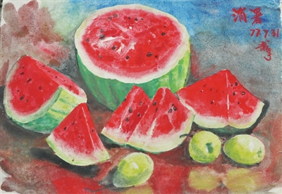 山乡春色(1970年3月 戴振宇作) 我父亲戴振宇小时候由于有着不俗的绘画天赋,从十二三岁起就饿着肚子(当时家庭生活困苦)站在梯子上,整天给镇上文化站画用8张整开白纸连在一起糊在木板上的布景和宣传画。那些信手画来的亭台楼阁、青山绿水栩栩如生,引得乡亲们从五里八乡赶来争相观赏,他的画名就从那时传开了。1959年,因为户口问题父亲错失了去六安艺校专业学习的机会,更为可惜的是,他于1959年以前创作的全部画作却被艺校招生老师带走了。 我是看父亲的画长大的。最初记忆是我5岁的时候,那时正值上世纪六七十年代,镇西不远处公路上有个大坎,两边是荒草山。隐约记得一天下午,母亲把我带到此处,看望正在这里一个语录碑上画巨幅领袖像的父亲。父亲见到我们,就从高高的架子上下来。我记得那天天空湛蓝,微风轻拂。 速写人像一(1976年8月 戴振宇作) 速写人像二(1976年3月 戴振宇作) 家里墙上自然是挂满父亲的画。有一幅油画画的是一个女子春天在水塘边洗衣服的背影。清清的塘水,跃出水面的鱼,桃花树下扑蝶的花猫,小石桥外水塘连着一片淡黄的油菜花地。远处树吐嫩绿,青山连绵。画上题了父亲填的词《蝶恋花》。另一幅,一群左邻右舍的女子来看新娘,新娘坐在床沿上,正要站起身来。画面下方的炭火盆里炭火烧得正旺…… 那时父亲经常拿起碳铅笔,用一个十六开的计分板夹上白纸,写生家人肖像。我们经常被要求坐好不动,只有不到十几分钟,可我觉得时间还是好长。虽未经过美术院校各种体系的素描训练,父亲线面结合的人物写生,也是结构严谨,迅速、精到、形象。他每年都被抽调到区里参加工作组,跑遍下面各个公社和大队,凭着一截碳铅笔画了大量的工人、农民头像速写。时隔多年后还有人能记起这件事。 父亲常常画水粉静物。家里买了水果,父亲先要画出来,然后再分给我们。等吃西瓜最着急。好不容易盼到买一个西瓜回来,切开后,空气中满溢着香甜气味,可父亲却要让我们耐心等,看他画。只见他先将半个西瓜放在后面,左面或右面放一切出1/4的瓜块,然后再把另一1/4瓜块竖切成几小块放在前面,同时还要母亲找一块他认为合适的布作为衬布。父亲告诉我们,画西瓜的关键是要掌控好水分的多少。这不,他笔下的西瓜新鲜、饱满,活生生地展现在纸上。 消暑(1977年11月 戴振宇作) 菜(1977年6月 戴振宇作) 父亲喜欢画秋菊。他有一个林场工作的朋友,送了他不少品种的菊花秧子,他一棵棵栽到瓦盆里。深秋时节,院子里各种菊花竞相绽放,黄的、白的、紫的、红的,有的像狮子头,有的似龙爪……父亲先考虑花的颜色,然后用大笔刷背景色,等底色干后再用圆头笔一笔一片花瓣,最后用明亮的颜色稍作提亮。画好后,是满纸的精神和傲骨。有一幅,父亲在上面填了一首《忆江南》:金风起,含笑开东篱。耻和百花争春秀,岂与众草比高低,冷暖心自知。 水粉写生(1977年12月 戴振宇作) 母亲去马鞍河洗衣服,父亲挑着衣服,带着我和妹妹一起去,到了以后父亲专心画他的画:浅黄白亮的沙子、清澈的河水、岸上的树、以及两个玩水的小孩都进入他的画中。母亲将洗好的衣服、被面,铺在沙滩上晒干后。父亲又挑着衣服,带着我们回家。 风景速写(1975年5月 戴振宇作) 父亲最早教我画画,是画在他正创作的一幅油画上:一个年轻男子站在一棵老柿子树枝丫上,看他的妻子捧起双手,接他抛下的长有三个柿子的小树枝,树枝上还有几片柿叶,画面右下方的草地上一堆柿子边上坐着两个小孩在互相说着什么,画面上方有一角蓝天白云,一群大雁正向南方飞去。父亲在画满树柿子时,用笔蘸了饱满的红柿子颜色,然后抱起我,要我大胆往树上点。我很茫然,不知所措,最终画下去,下笔很重,那一点显得很笨重,至今我还能感觉到当时手上所用的力量。 还有一幅画令我记忆犹新。那时正兴移风易俗,父亲创作了一幅名曰《迎新郎》的画,画的是农村男子倒插门到一独生女家的场面,画面的中心新郎和新娘在众人的簇拥下往新娘家走去。我记得很清楚,为了这幅画的题目,父亲着实费了一番心思。这幅画后来被选中参加了当年省里的画展。当年腊月,县文化馆来信说《迎新郎》被印刷成了年画,在新华书店发行。父亲和同事一起天天去镇上的新华书店看那里卖的年画,终究没有看到自己的作品,不知发行在了哪里。 静物(1977年12月 戴振宇作) 父亲将自己的写生装订成一本画集,我翻看过无数遍。因生活所限,这些画都画在各种空白纸上,父亲老是自夸,说他画完画的洗笔水不脏,透过他画作的画面就可以看出他对所用颜料的珍惜和慎重。绘画材料的限制并没有影响画面的生动效果,其中不少风景写生作品,记录了他十几岁到四五十岁时所到过的地方。一幅幅水彩、水粉和碳铅速写,画面都那么空濛灵秀、清朗透明,带着浓浓的诗意,洋溢着对生活的热爱。龙河口水库、将军山大渡槽建设时的场面也被他用速写形式记下来,整理后,入选了那个时代省里的工农兵画展。除了家乡的风景,还有反映了半个世纪前如合肥大蜀山、逍遥津、三河新河、巢湖、六安大淠河、霍山黑石渡等地的四季风貌和乡土风情的画,这些应该是极为珍贵的地方图像资料吧。画集里还有后院老柿子树、我家老屋当年模样、街道早市的热闹场面以及老街旧时风貌,有四时瓜果和生活物品。通过这些画,让我又