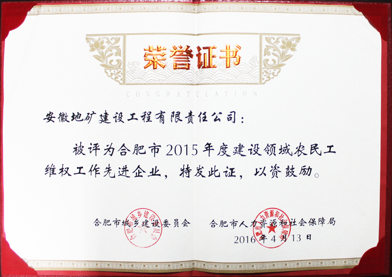 日前,我队地建公司受合肥市城乡建设委员会、合肥市人力资源和社会保障局联合表彰,荣获“合肥市2015年度建设领域农民工维权工作先进企业”称号。
