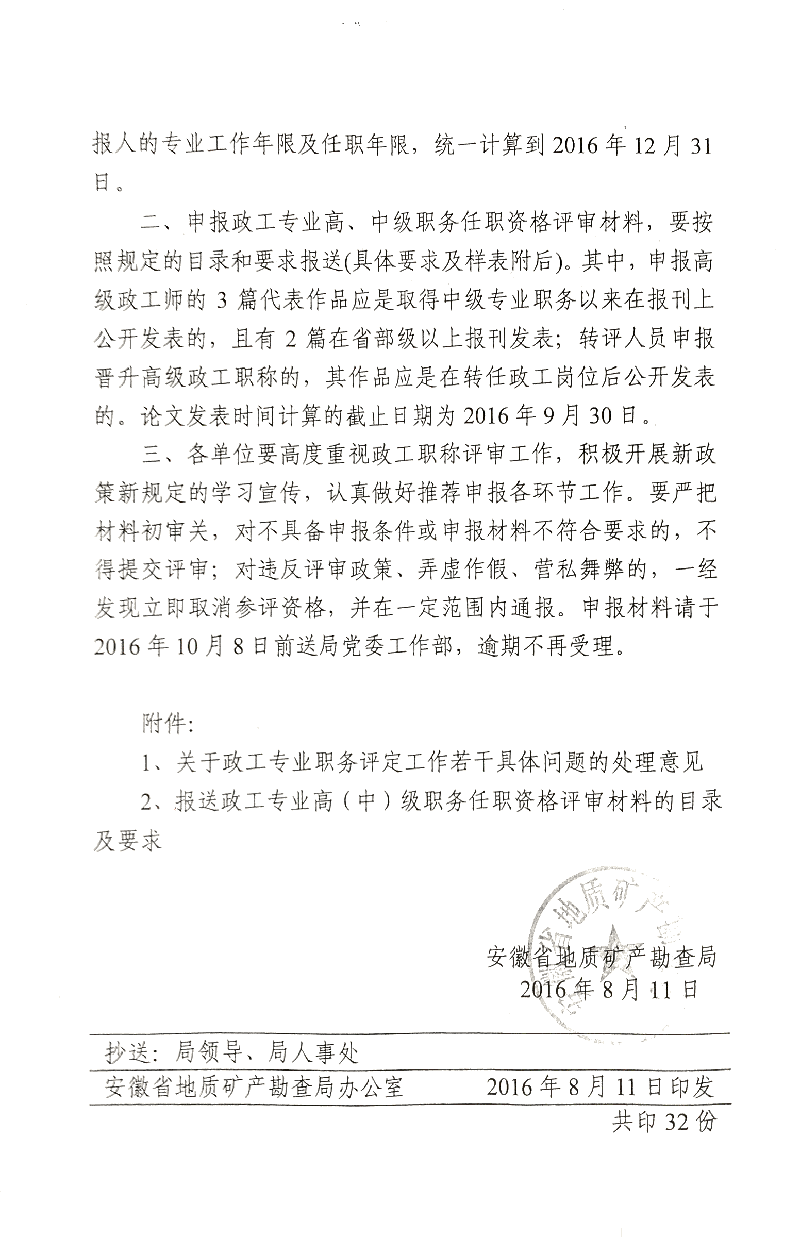省局2016年度政工专业职务任职资格评审工作已经开展,现将通知内容全文转发。请各单位做好有关政策的学习宣传。请符合政工专业职务任职资格评定范围、标准和条件的人员与队党办联系,领取评审相关材料,并于9月20日前将申报材料报送至队党办审核,逾期不再受理。