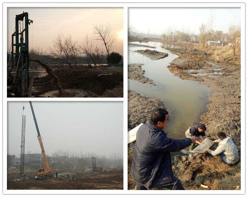 俗话说,良好的开始是成功的一半,但这个项目建设之初确实困难重重。主基所在地——六安市霍邱县王截流乡茶袁村老张家的后鱼塘里,满塘残落的荷叶,黑黢黢的淤泥静卧在清冷的水下。要想开工,首先要清塘,项目部几个人像渔夫一样穿着齐胸的大长皮裤开沟排水下塘清淤,还要从十几公里外拉砖渣来填塘。整个施工期间因民事问题多次遇阻,项目部人员无奈地说:“施工本身之外的‘意外状况’层出不穷,太锻炼我们的沟通和应变能力了!”