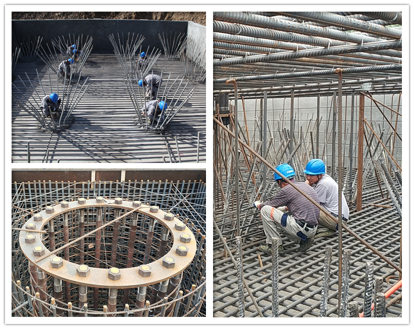 5月1日,虽然刚到劳动节,气温已经相当高了,阳光照得人眼睛睁不开。村里的墙上刷着红红的“撸起袖子加油干”,沿着淮河岸边行进,视野开阔,水面波光。进入南跨主基施工现场,大家正在井然有序地进行施工作业。此时,南跨的ABCD四个立柱,也就是“四条腿”已经初见雏形。A柱中间,铺设的钢筋已经被刷上保护层,工人们正在进行钢筋绑扎。王树生介绍:“这个钢筋铺设一层就要160根,光主基一个立柱就需要铺设3000多根钢筋,主基和锚塔合计要使用钢筋528.7吨。”环顾现场,工地上不仅码放着待使用的钢筋,就连废钢筋也都是码放整齐。