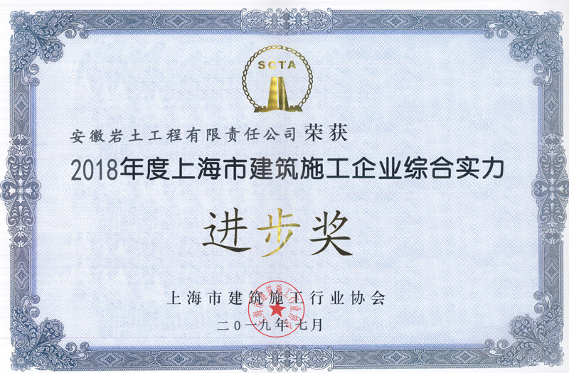 近日,我队安徽岩土工程有限责任公司收到上海市建筑施工行业协会的评比结果,荣获“2018年度上海市建筑施工企业综合实力进步奖”。这也是岩土公司连续第三年获得此项荣誉。近年来,队岩土上海分公司积极开拓市场,奋勇拼搏,在上海市建筑市场中的影响力和知名度不断扩大,企业自身综合实力也得到了稳步增强。
