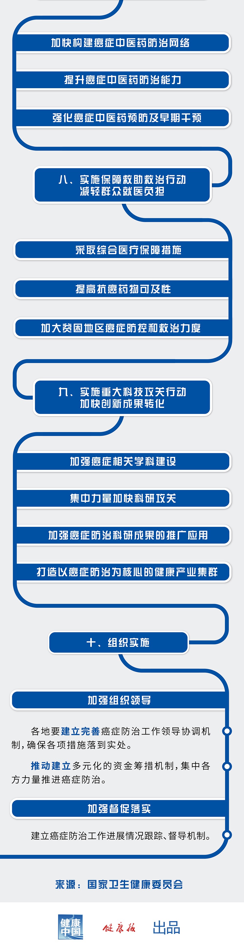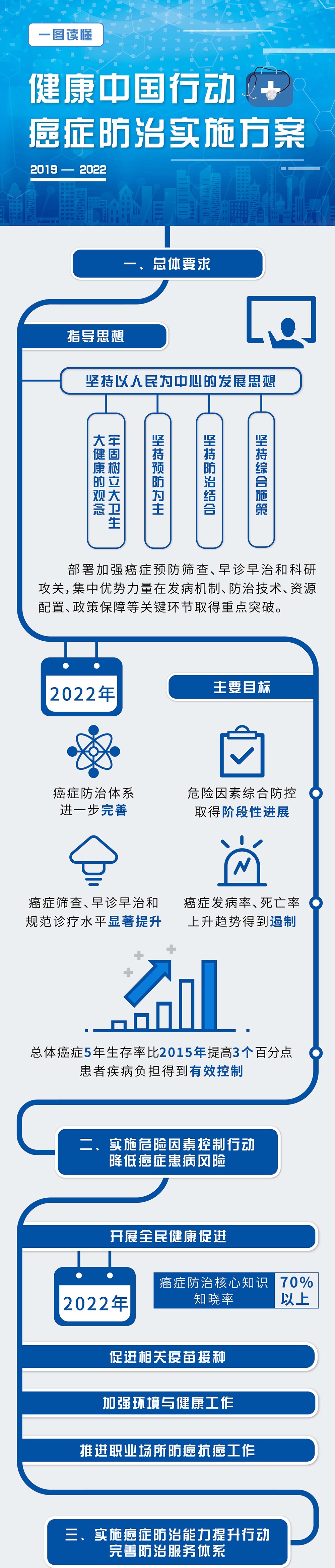 2016年,中共中央、国务院印发《“健康中国2030”规划纲要》,确定了癌症防治的目标任务,随后,国务院办公厅印发《中国防治慢性病中长期规划(2017—2025年)》,将提高总体癌症5年生存率作为防治工作主要目标。2019年6月,国务院印发《关于实施健康中国行动的意见》,明确提出实施癌症防治行动。为贯彻党中央、国务院决策部署,深入推进癌症防治工作,国家卫生健康委会同有关部门制定《健康中国行动——癌症防治实施方案(2019—2022年)》。