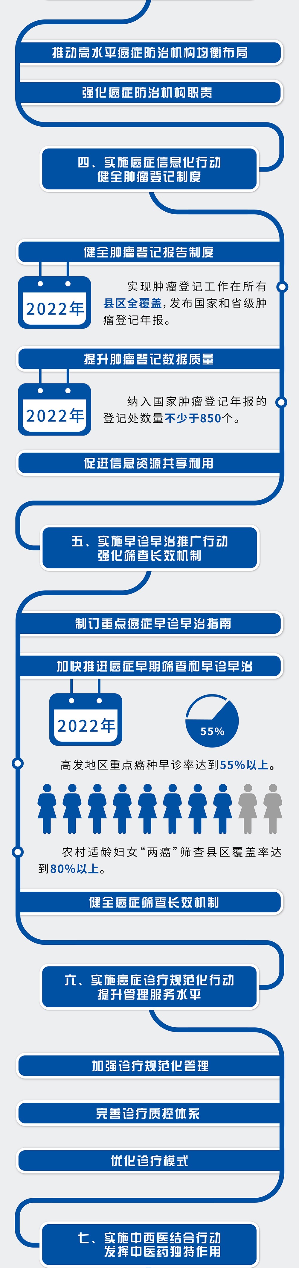 《实施方案》阐明了癌症防治工作的指导思想,提出坚持以人民为中心的发展思想,牢固树立大卫生、大健康的观念,坚持预防为主、防治结合、综合施策,创新体制机制和工作模式,聚焦癌症防治难点,集中优势力量在关键环节取得重点突破。基于当前癌症防治现状和工作要求,明确到2022年,“癌症发病率、死亡率上升趋势得到遏制,总体癌症5年生存率比2015年提高3个百分点”的总体目标及5个可量化的工作目标,同时围绕目标要求提出八项主要行动。