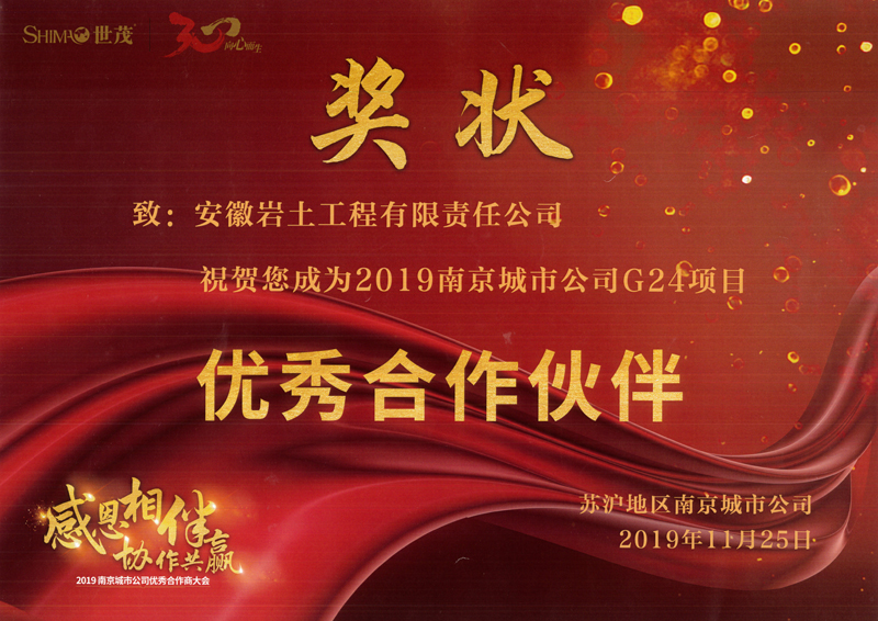 近日,队岩土上海分公司承接施工的南京下关及南京G24两个项目分别获得世茂集团南京城市公司的“最佳供货配合奖”和“优秀合作伙伴”称号,同时岩土上海分公司被评为 “年度优秀合作伙伴”。